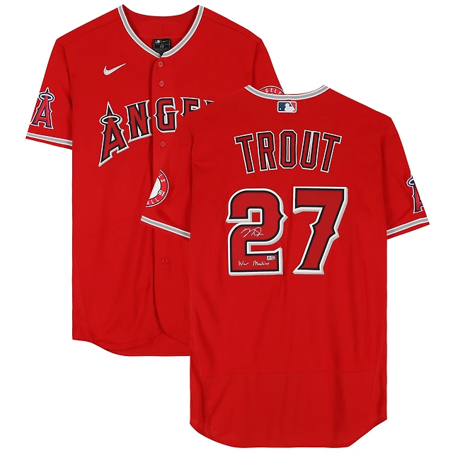 Maillot Nike authentique rouge autographié par Mike Trout des Los Angeles Angels avec inscription « War Machine »