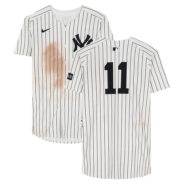 Maillot Nike blanc à rayures fines n° 11 des Yankees de New York, Anthony Volpe, utilisé lors du match contre les Rays de Tampa Bay, le 31 juillet 2025.
