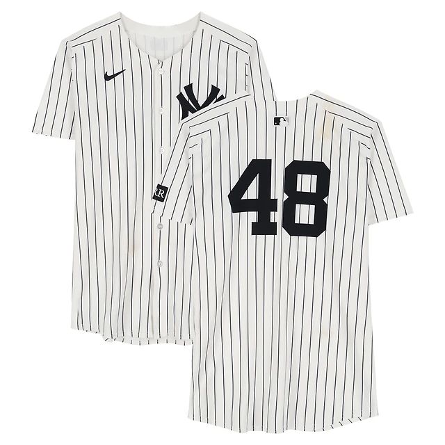 Maillot Nike blanc à rayures fines n° 48 de Paul Goldschmidt, porté par les Yankees de New York, lors du match contre les Cubs de Chicago, le 13 juillet 2025.