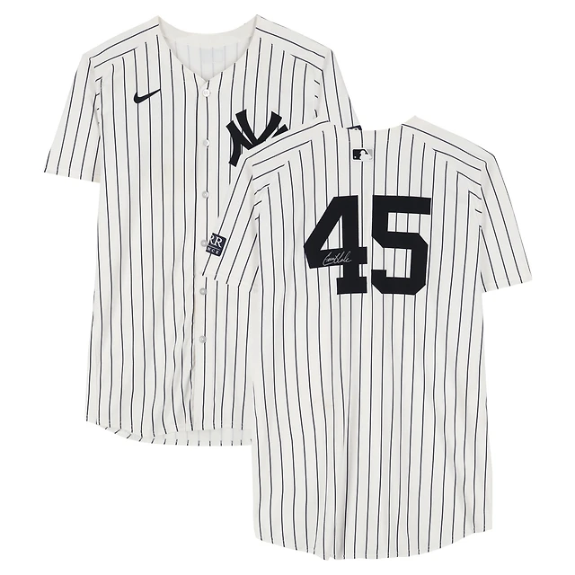 Maillot Nike blanc à rayures fines numéro 45 dédicacé par Gerrit Cole des Yankees de New York lors du match contre les Mets de New York le 24 juillet 2024