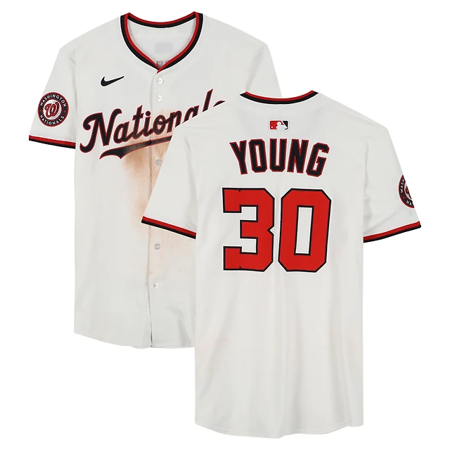 Maillot Nike blanc n° 30 de Jacob Young, porté par les Nationals de Washington lors du match contre les Phillies de Philadelphie, le 27 mars 2025