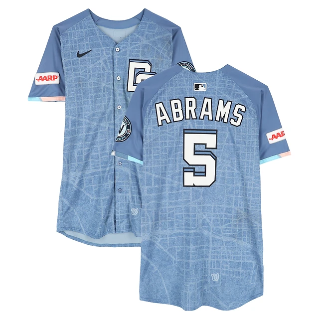 Maillot Nike City Connect bleu n° 5 de CJ Abrams, porté par les Washington Nationals lors de plusieurs matchs de la saison 2025 de la MLB.