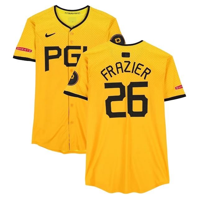 Maillot Nike City Connect doré n° 26 des Pirates de Pittsburgh, porté par Adam Frazier, utilisé lors du match contre les Padres de San Diego le 2 mai et les Braves d'Atlanta le 9 mai 2025.
