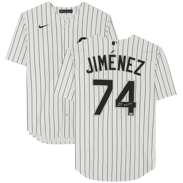 Maillot Nike réplique à rayures blanches autographié par Eloy Jimenez des Chicago White Sox