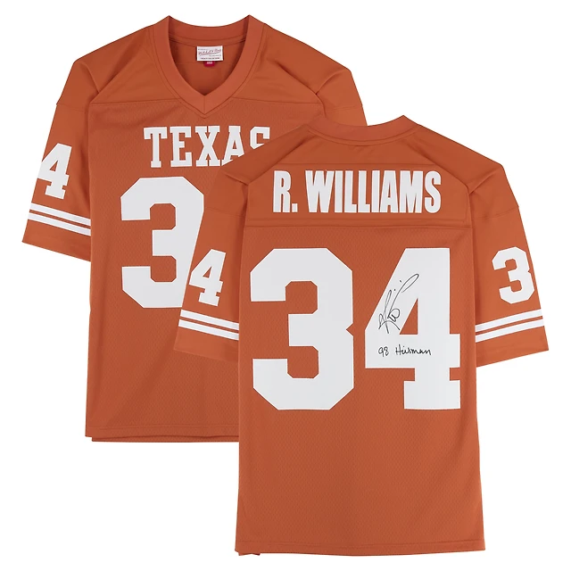 Maillot réplique orange autographié par Ricky Williams des Texas Longhorns, Mitchell & Ness, avec inscription « 98 Heisman ».