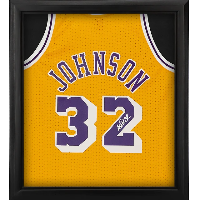 Maillot Swingman doré autographié par Magic Johnson des Los Angeles Lakers, Mitchell & Ness, Shadowbox