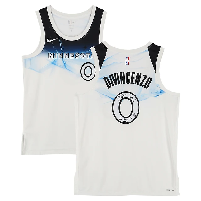 Maillot Swingman Nike City Edition 2024-25 blanc dédicacé par Donte DiVincenzo des Minnesota Timberwolves avec inscriptions « Big Ragu » et « Can't Knock the Hustle