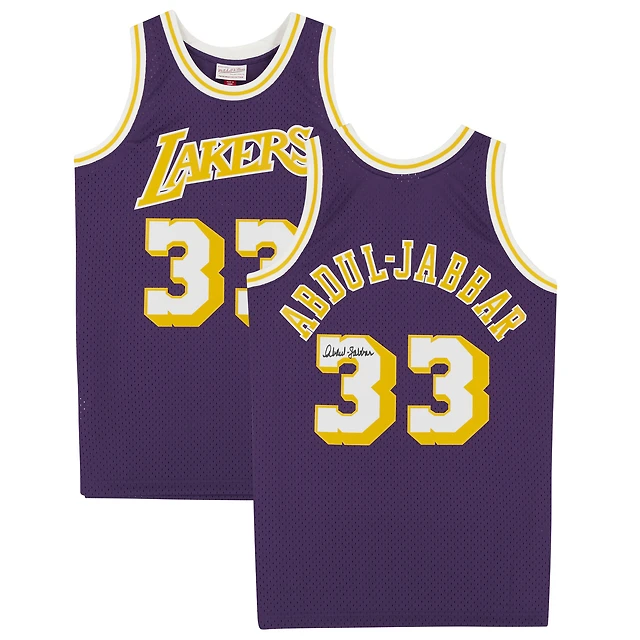 Maillot Swingman violet autographié par Kareem Abdul-Jabbar des Los Angeles Lakers Mitchell & Ness 1983-84