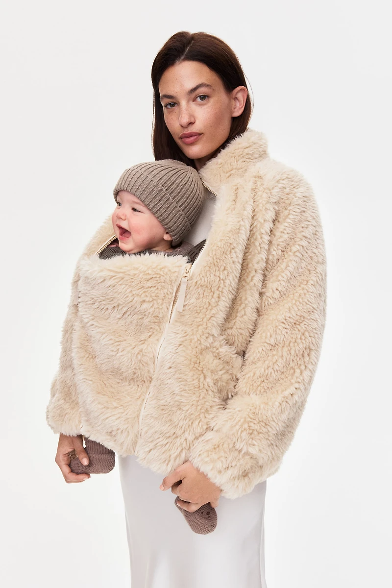 Jacket in soft, fluffy fabric for wear during and after pregnancy when carrying your baby. Stand-up collar, zipper at front, raglan sleeves with elasticized cuffs, and open front pockets. Concealed, elasticized drawstring at hem with a cord stopper for adjustable fit. Detachable babywearing panel with covered elastic at lower edge. Lined.