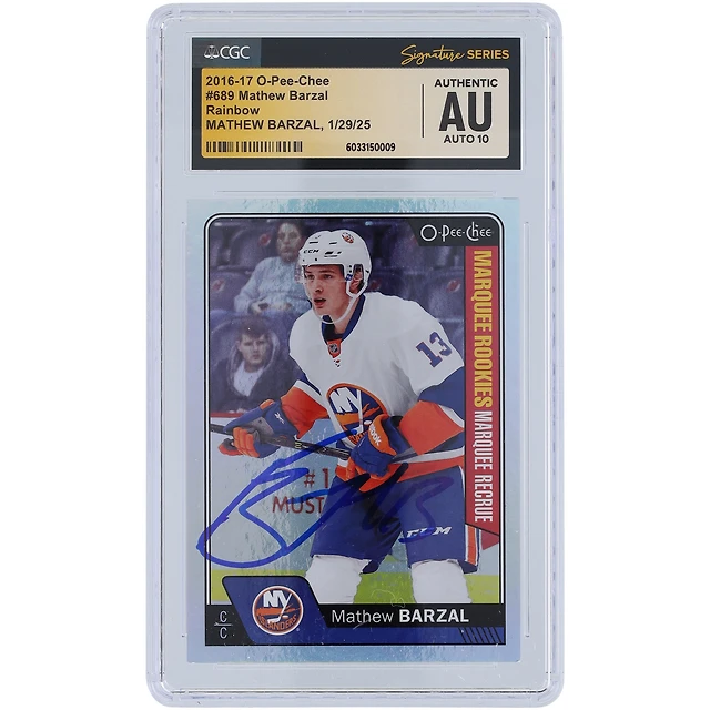 Mathew Barzal des Islanders de New York a autographié la carte de recrue autographe Upper Deck O-Pee-Chee 2016-17 Rainbow #689 des fanatiques de CGC. Les recrues ont été témoins de la carte authentifiée Auto 10.