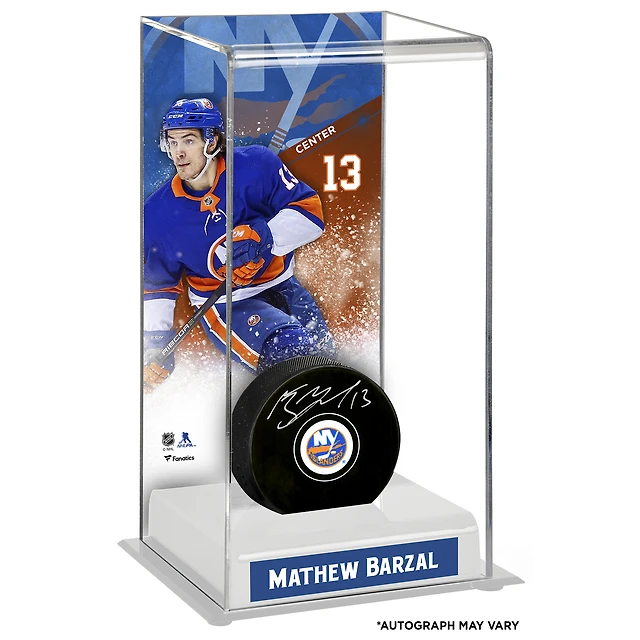 Mathew Barzal New York Islanders Autographed Puck with Deluxe Tall Hockey Puck Case