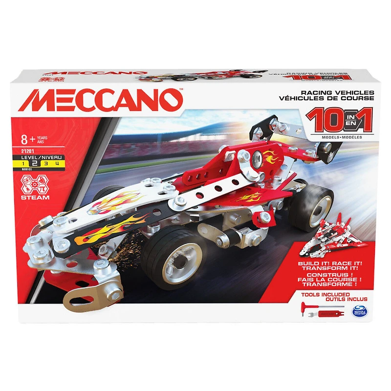 Build it, race it, transform it with the Meccano 10-in-1 Racing Vehicles Set! Ideal for the novice builder, this STEM building set has everything you need to assemble and re-assemble 10 high-speed performance cars, planes, boats and more (one at a time). With 225 parts, two real tools and an easy-to-follow instruction guide (for three vehicles), build a sleek race car, fighter jet and a racing boat, or use your imagination to create your own vehicle! Customize your model cars and vehicles with two sticker sheets and choose from flames or modern designs. After you complete one model, display it, race it, or take it apart and build something new! As you construct your racing vehicles, you'll develop an understanding of science, technology, engineering, and math, while strengthening your hand-eye coordination, problem-solving and fine motor skills. Meccano toy building sets and educational toys are the perfect gifts for kids. For more ways to create with your 10-in-1 Racing Vehicles Set, additional build instructions are available on Meccano.com. Build and rebuild like never before with the Meccano 10-in-1 Racing Vehicles Set!