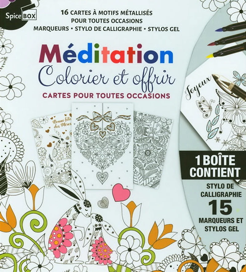 This box contains everything to meditate, colour and offer! You'll have fun colouring 16 metallic pattern cards for all occasions with a variety of markers and gel pens. Also includes a calligraphy pen for writing little messages.Author: CollectivePublisher: SpiceboxNumber of pages: 16ISBN: 9781771327091