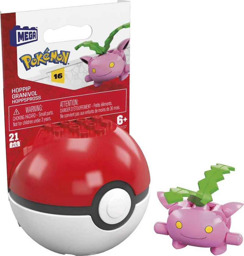 Pokemon Trainers might get chomped while battling this buildable Hoppip. Open the Nest Ball to build your very own Hoppip then pose it in a number of stances to face opponents. Discover even more Pokemon building sets when you build all 6 in the series, each sold separately. MEGA Pokemon building toys are designed for ages 6 and up