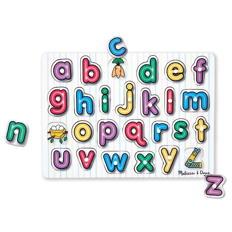 This wooden peg puzzle includes a piece for each of the 26 letters in the alphabet. A colorful picture under each piece shows an image beginning with the same letter, helping to develop letter recognition and pre-reading skills! Also encourages hand-eye, fine motor, and visual perception skills.