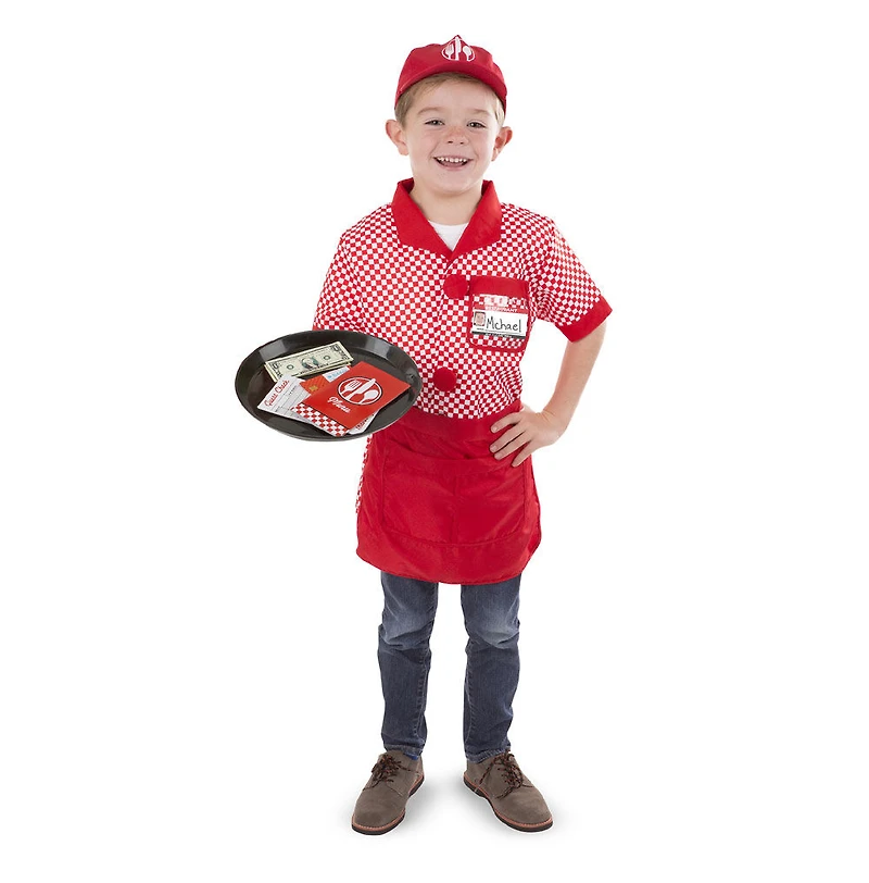 Includes shirt, half apron, cap, name tag for pencil personalization, tray, menu, write-on guest check, play money and credit card