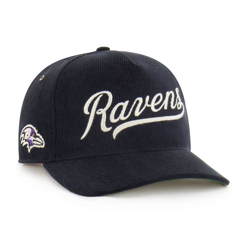 Celebrate the legacy of the Baltimore Ravens with this Golden Age Corduroy Hitch Adjustable Hat from '47. Featuring a retro-inspired silhouette with a pinched five-panel crown, this hat combines vintage charm with modern comfort. The team wordmark embroidered across the front proudly displays your Baltimore Ravens pride, while the corduroy fabric and contrast color undervisor add unique style.