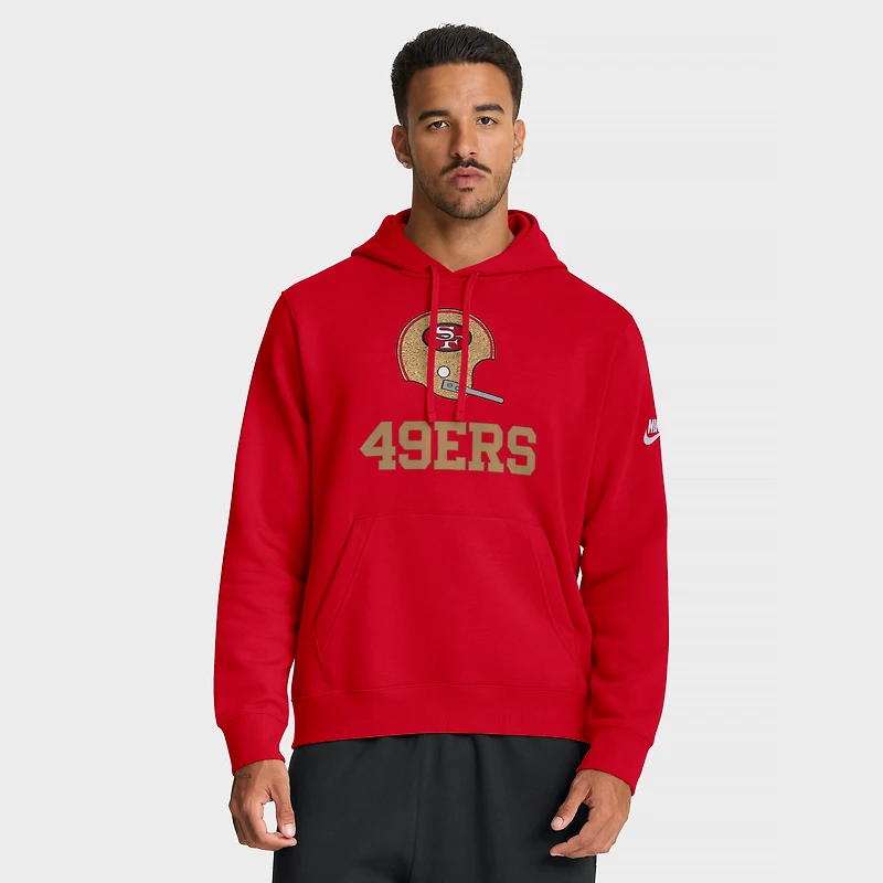 Sport a throwback San Francisco 49ers look with this Rewind Club Pullover Hoodie by Nike. It features a vintage team logo printed on soft, durable blended material. Fleece lining adds an extra layer of warmth, while a drawstring hood lets you adjust the coverage of this San Francisco 49ers hoodie.