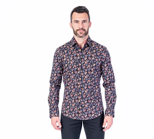 Micro/Stretch Floral Print Sport Shirt - Black/Burgundy
