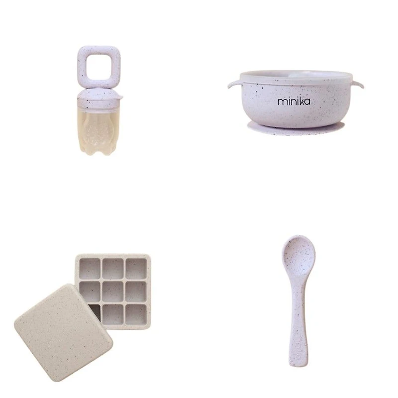 Silicone food introduction set. Pack of 4. Minika Creates Simple and clean products, with designs that are unique and timeless. Spoil your minis by offering them quality products!
