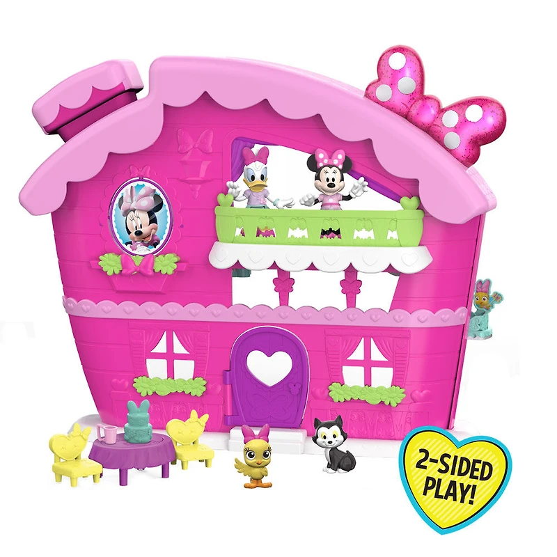 R Exclusive, only available at Toys R Us Canada. Join Disney Junior's Minnie Mouse in her fantastic new Bowfabulous Home! This two-level, two-sided playset features a twinkling multi-colored light and sounds bow. Minnie fans will love using the furniture to customize and decorate her home. There are so many surprises inside! Step on the doormat to "magically" open the front door, take the kid-powered elevator to the 2nd floor and flip the dining room tabletop to reveal delicious looking snacks! Minnie's vanity table also features a fun, kid-powered spinning mirror! Of course, no visit to Minnie's home is complete without a ride down the slide! Set includes an articulated 3" Minnie Mouse figure, articulated 3" Daisy figure, Figaro figure, and 15 accessories to create a bowtastic experience! Requires 3 AAA batteries (included). Ages 3+