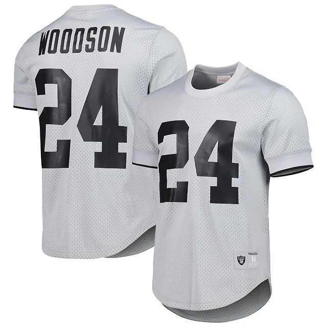 Mitchell & Ness Charles Woodson pour hommes, gris, Oakland Raiders, nom et numéro du joueur retraité, haut en maille