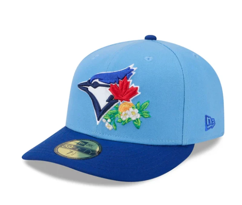 The Toronto Blue Jays 2026 Spring Training 59FIFTY Fitted Cap features an embroidered floral Blue Jays logo at the front panels with a 2026 Spring Training patch at the right-wear side and the MLB Batterman logo at the rear. Additional details include an embroidered spring training location at a gray undervisor and a floral lining. This cap comes with a pre-curved visor.