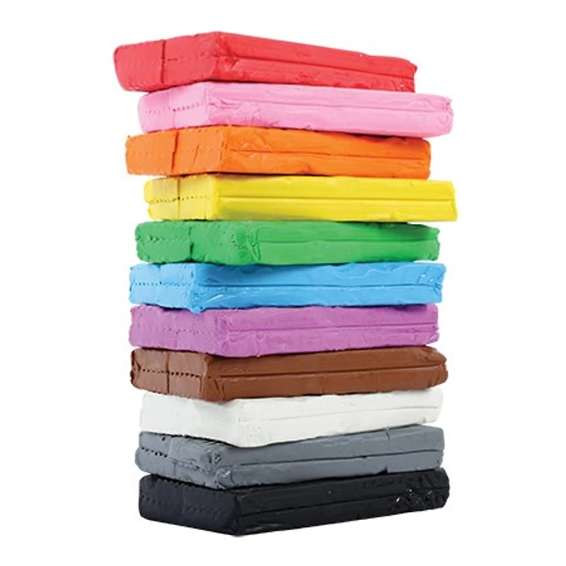 Non-toxic modeling clay, flexible, clean and reusable for ages 3 and up. Several colours available. Colours: red, orange, yellow, green, clear blue, terra cotta, brown, gray, black and white. Modeling clays also available in a set of 6 assorted colours or neon.