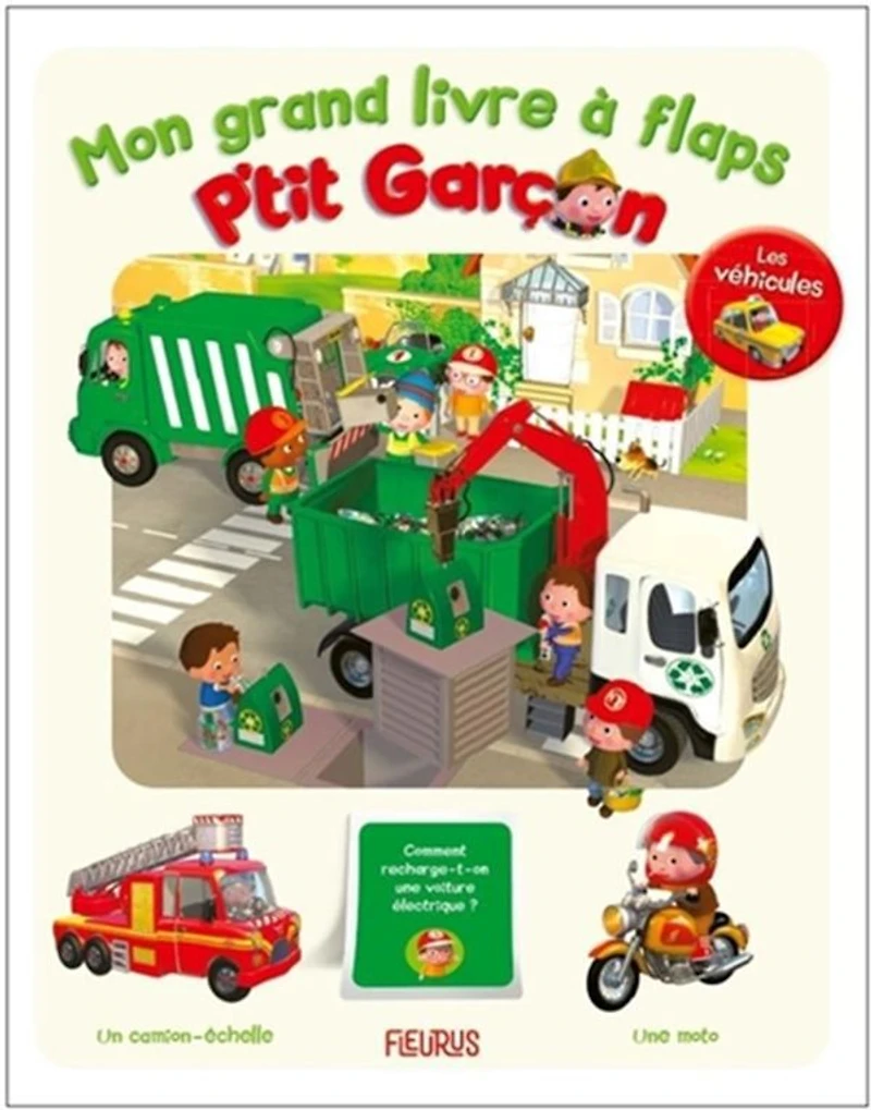 Book is in French An album with flaps to lift and discover the different vehicles: truck, motorcycle, backhoe loader, among others. With elements to be found in each major scene.