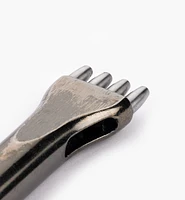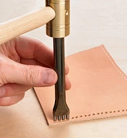 This multi-hole punch makes a row of neat, even holes sized to match our lacing. When you strike it with a mallet, each of the four tips cuts a 2mm diameter hole. Registering one of the tips in the last hole punched ensures consistent spacing. Made of hardened high-carbon steel to withstand prolonged use.