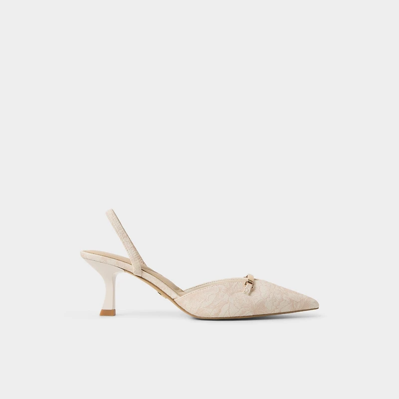 Petal-woven brocade drapes this pointed-toe slingback in shimmer, a kitten-heel lift crowned by a gleaming gold buckle that adds polish for aisle walks and gallery openings. Pair with a sleek suit for presentations, or let it peek beneath satin midis at late-summer weddings, effortlessly chic.
