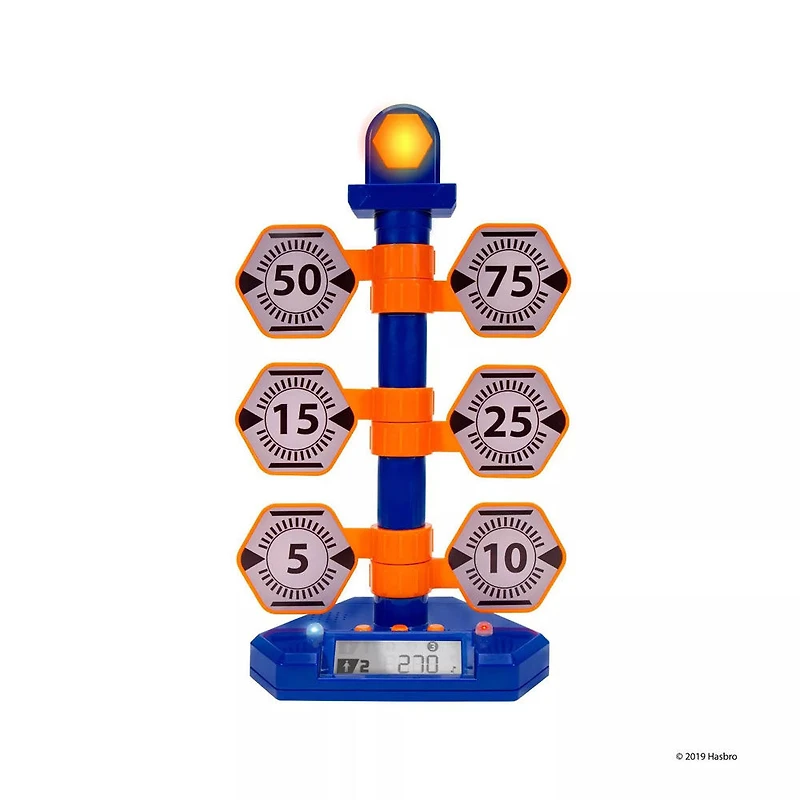 Your kiddo will learn and practice aim as they send objects at the Nerf Digital Light-Up Target. This interactive digital target buzzes with sound and lights the target that has been hit, while the digital scoreboard tracks and displays their score. Featuring both single and multiplayer interactive game play modes, the lights and sound target is compatible with most Nerf blasters for hours of fun.
