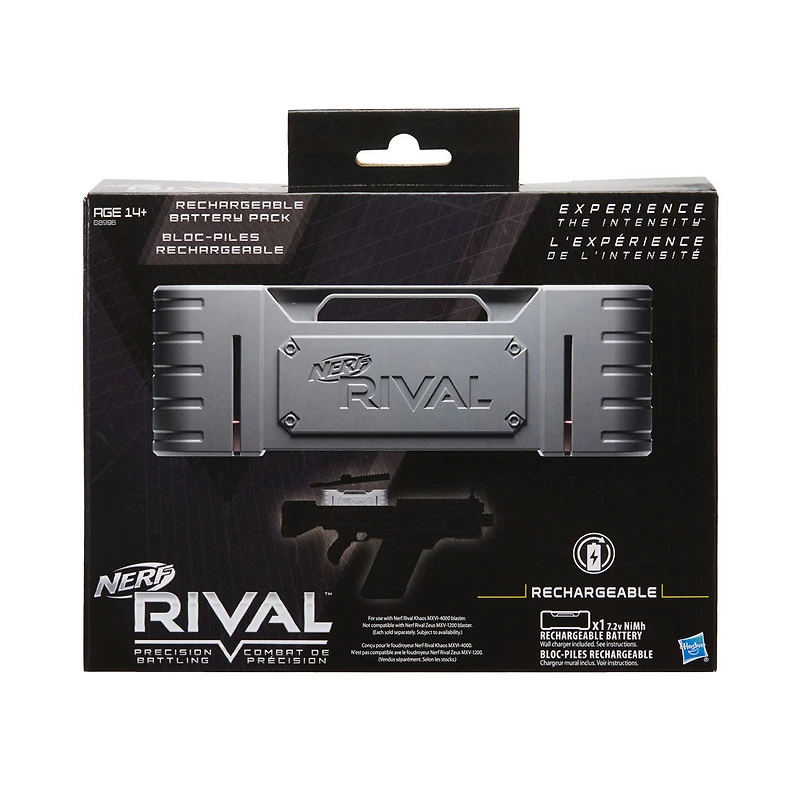 Experience head-to-head competition with the precision and power of the Nerf Rival blasters! Use this rechargeable battery pack with Nerf Rival Khaos MXVI-4000 blaster (sold separately) instead of batteries to increase the blaster's rate of fire. With this rechargeable pack, there's no need to stock up on batteries - just recharge and get back into battle! Includes wall charger.