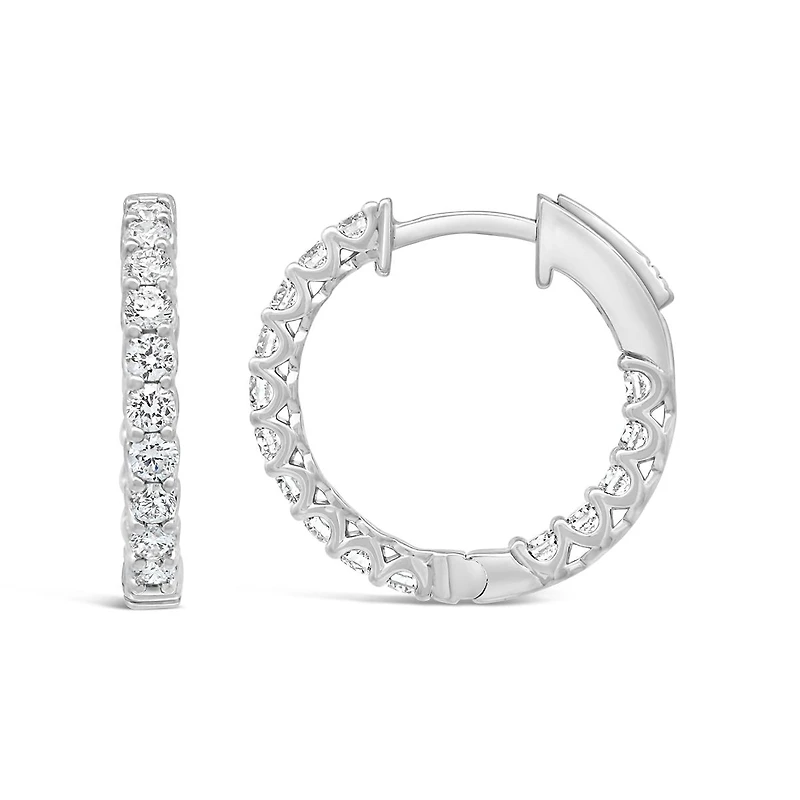 Sparkling from every angle, these New Brilliance hoop earrings are set with a continuous row of round lab grown diamonds totaling 1.02 CTW. Each diamond is prong‑set in polished sterling silver, creating an elegant scalloped silhouette that enhances light reflection and adds dimensional brilliance. The inside‑out design ensures maximum sparkle whether viewed from the front or the side.