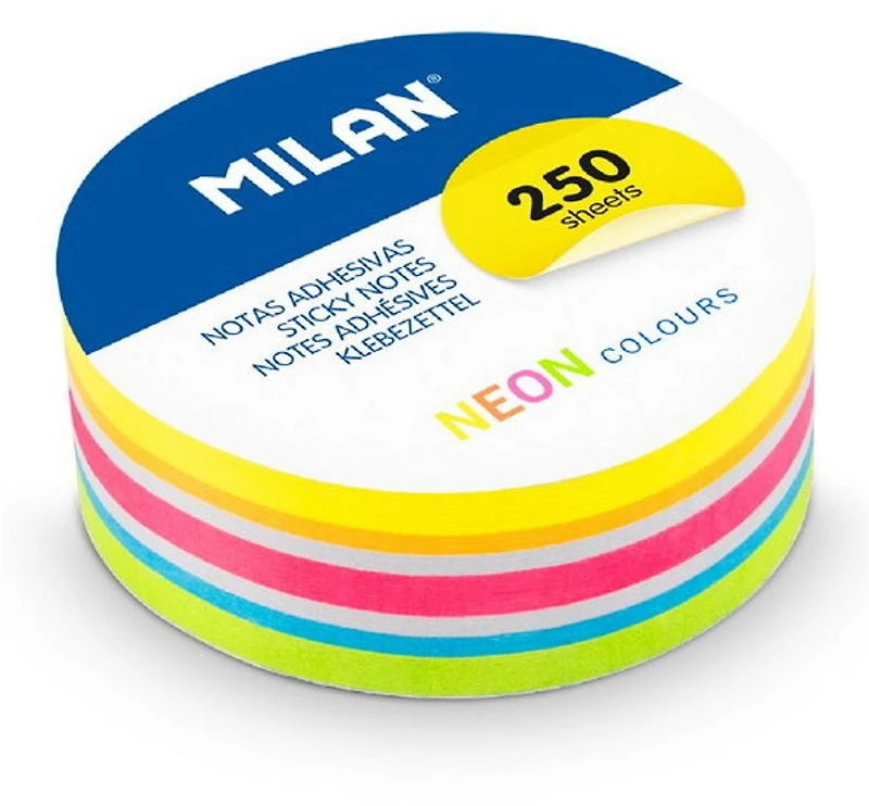 Notes adhésives amovibles rondes en couleurs fluorescentes et feuillesblanches. Idéal pour mettre en évidence des messages, des notes, classeret trier l’information. Contient 250 feuilles : 50 jaunes, 25 oranges,50 blanches, 50 roses, 25 bleues et 50 vertes. Dimensions : Ø 67mm x 2,8cm.
