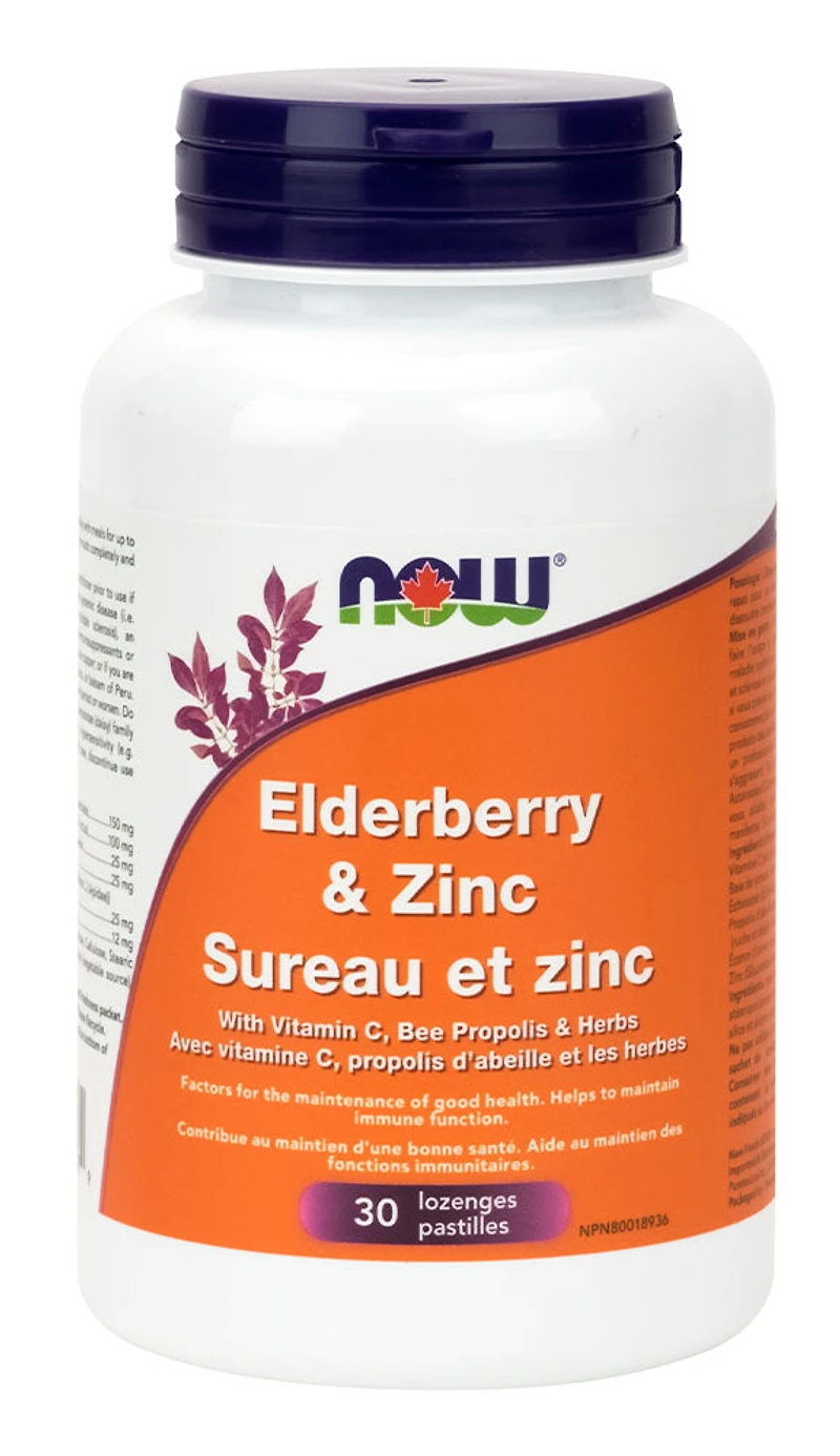 Helps maintain immune functionSupports Immune SystemEnhanced with Vitamin C, Propolis and Slippery ElmSupport for Seasonal ChangesDescriptionNOW - Elderberry & Zinc (30 lozenges) - 30 Lozenge(s) - NPN: 80018936 -- Each lozenge contains Elderberry Extract powder that is synergistically formulated with Zinc and Vitamin C for maximum effectiveness. Zinc is a trace mineral that plays an important role in supporting a healthy immune system. Echinacea, Propolis and Slippery Elm have been added to complement this unique formula helping to soothe a sore throat and fight cold and flu symptomsINGREDIENTS