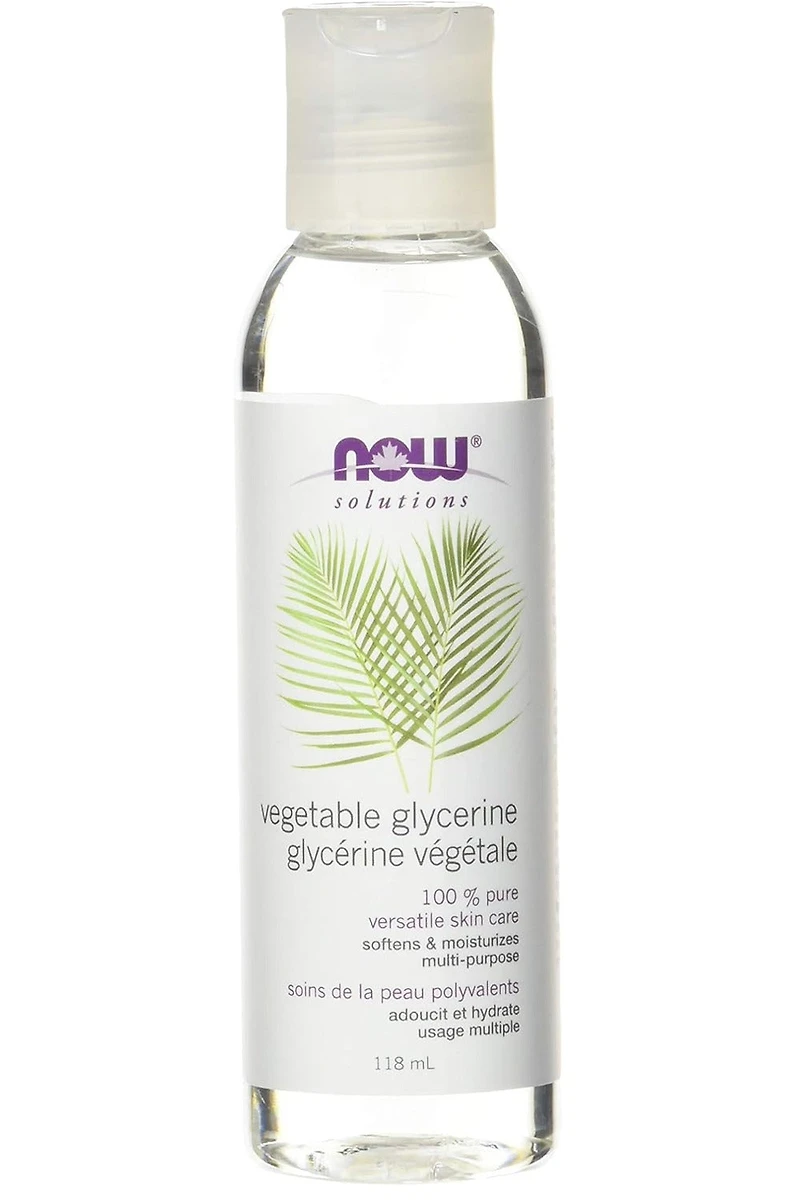NOW - Vegetable Glycerine - 118 Millilitre(s)NOW® Solutions Pure Vegetable Glycerine is an outstanding moisturizer and skin cleanser that also provides softening and lubricating benefits. It's hypoallergenic and easily soluble in water, making it suitable for use in all of your favourite cosmetic applications. Pure Vegetable Glycerine has a long shelf life and does not easily oxidize. It is a natural product derived from Non-GMO palm oil or vegetable oil. At NOW® Solutions our team of health and beauty experts are passionate about creating unique personal care formulas that bring out your inherent beauty using some of nature’s purest and most effective ingredients. We take great pride in sourcing natural, organic, only clean, Non-GMO, premium ingredients, as well as being a part of PETA’s Beauty Without Bunnies cruelty-free certification. NOW makes products that empower people to lead healthier lives.Cruelty Free, Made w/o Gluten; Vegan / VegetarianDIRECTIONS & USEFor soft, luxurious skin simply massage a few drops of Pure Vegetable Glycerine on the desired area as needed. Please recycle container.CAUTIONS & NOTESDiscontinue use if redness or irritation occurs.INGREDIENTSPure Vegetable Glycerine.