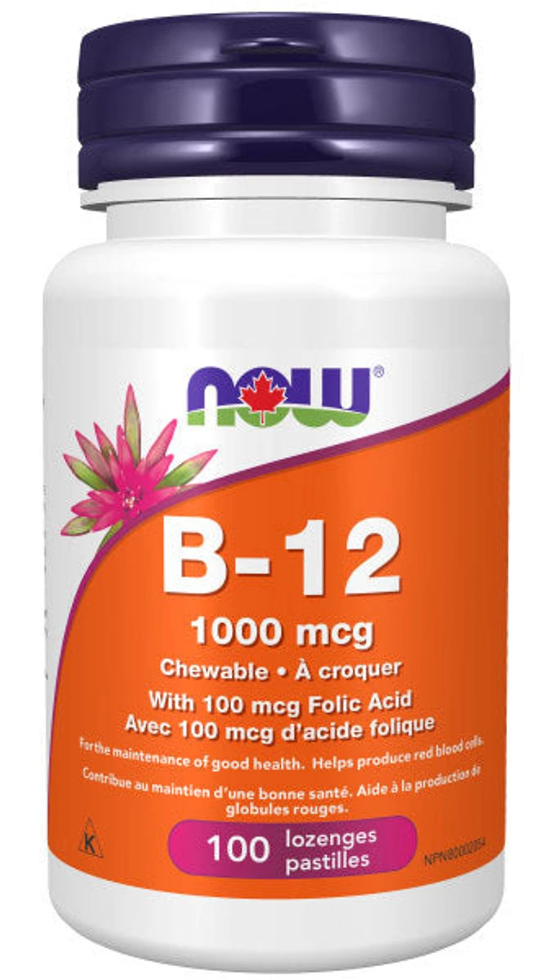 Helps produce red blood cells and treat pernicious anemiaSupports nerves and energyFor the maintenance of good healthVegetarian/VeganChewable, with 100 mg Folic AcidDescriptionNOW - Vitamin B12 + Folic Acic - 250 Lozenge(s) - NPN: 80002054 -- Now Vitamin B-12 (Cyanocobalamin) is a water soluble vitamin necessary for the maintenance of a healthy nervous system and for the metabolic utilization of fats and proteins. Vitamin B-12 is also essential for the synthesis of DNA during cell division and therefore essential for the synthesis of DNA during cell division and therefore is especially important for rapidly multiplying cells, such as blood cells. In addition, adequate intake of Vitamin B-12, along with Folic Acid and Vitamin B-6, encourages healthy serum homocysteine levels, thereby supporting cardiovascular health. Because Vitamin B-12 is found predominantly in animal products, strict vegetarians are at risk of developing Vitamin B-12 deficiency and may benefit from supplementation. NOW® Vitamin B-12 is vegetarian/vegan (non-animal derived). NOW® B12 Lozenges also contain 100 mcg of folic acid to boost red blood cell production. These natural fruit flavoured lozenges can be chewed or used sublingually under the tongue.INGREDIENTS
