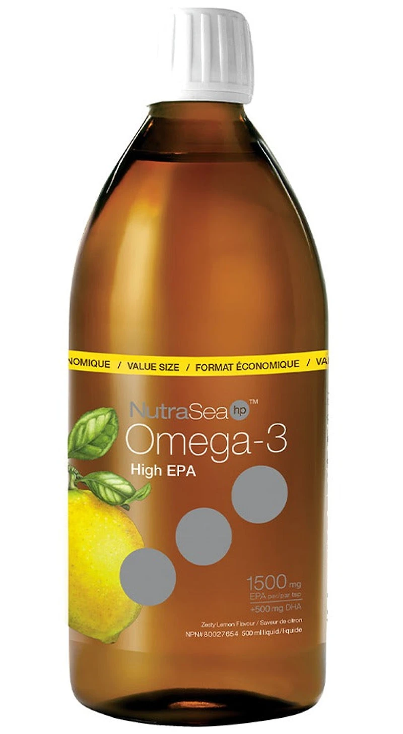 Beneficial In Support Of Cardiovascular HealthSupports Joint Health And MobilityPromotes Healthy SkinSupports Positive Mood And Well-Being3: 1 EPA/DHA RatioDescriptionNutraSea - Omega 3 - 500 Millilitre(s) - NPN: 80027654 -- You'll enjoy the clean, light taste of NutraSea HP premium quality, high EPA liquid omega-3, in a delicious lemon flavour, with no fishy burp-back. With its high EPA ratio of 1500 mg EPA and 500 mg DHA per dose, NutraSea is an easy way to get your high EPA omega-3 and is a great choice for anyone looking for a pure omega-3. NutraSea HP supports the maintenance of good health and cognitive & brain function. It also helps support the development of the brain, eyes and nerves in childrenINGREDIENTS