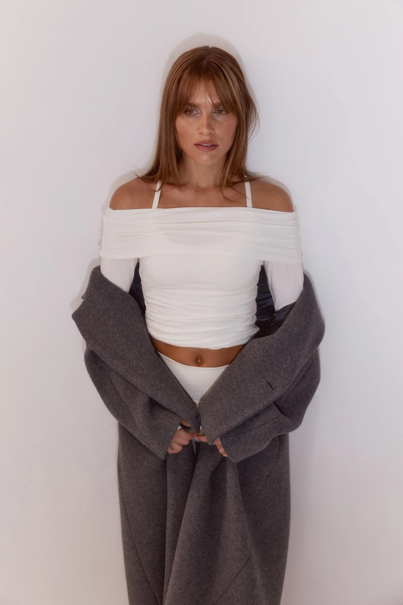 Slim-fit, off-the-shoulder sports top in soft modal jersey. Wide, foldover upper edge and long sleeves.