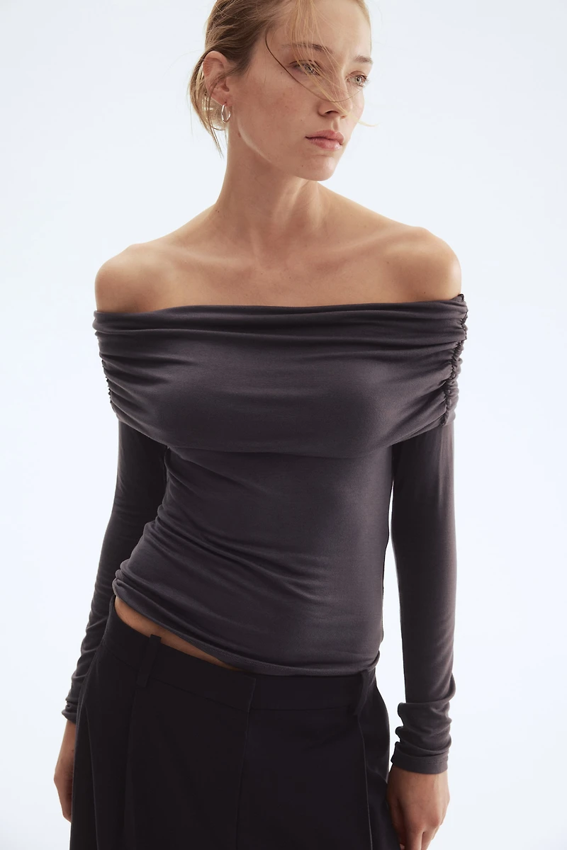 Fitted, off-the-shoulder top in stretch jersey. Wide, foldover upper edge with gathered side seams for a gently draped effect. Long sleeves and raw edges at cuffs and hem.