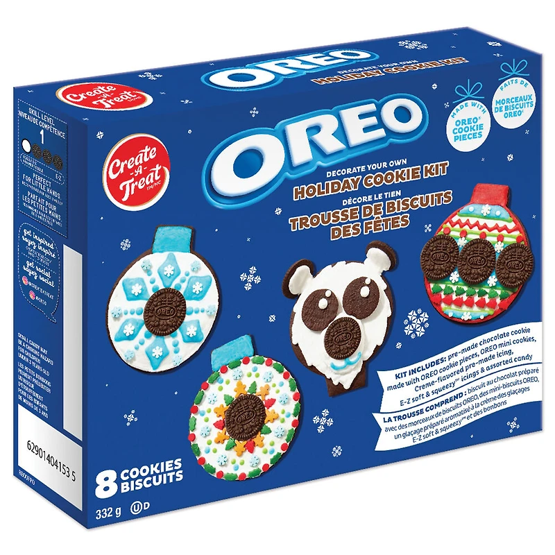 This kit includes 8 pre-baked chocolate cookies made with OREO cookie pieces, Mini OREO cookies, a pre-made crème-flavoured white icing pouch, 3 icing writers in red, green and blue, and festive winter themed sprinkles for decorating.