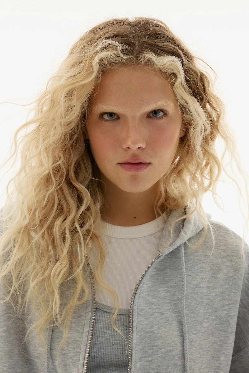 Oversized hooded sweatshirt jacket with a soft, brushed inside. Double-layered hood, zipper at front, and kangaroo pockets. Heavily dropped shoulders, long sleeves, and ribbing at cuffs and hem.