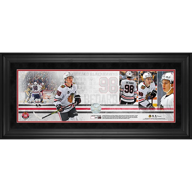 Panoramique encadré de 10" x 30" de Connor Bedard des Blackhawks de Chicago, premier match de la LNH, avec un morceau de filet utilisé lors du premier match de la LNH - Édition limitée à 198 exemplaires