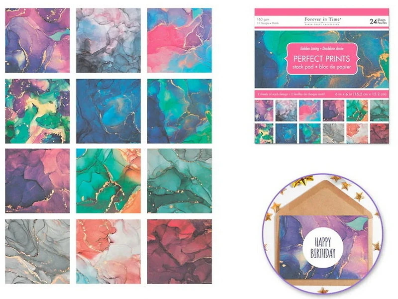 Add a touch of elegance to your paper crafts! The 6"; x 6"; “Gold Lining” stack pad features refined designs highlighted with gold accents, ideal for elevating your projects with style and shimmer.