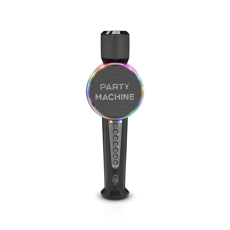 Microphone with Built-in Bluetooth Speaker Lighting effects sync with music and singing Works with all music and karaoke apps Rechargeable battery for hours of fun 6 fun voice changing effects including: echo, female, male, chipmunk, robot and radio! 1-touch lead vocal removal for a true karaoke experience Crisp, clear loud built-in speaker Adjustable microphone volume control SMM548 Party Machine Mic Micro-USB charging cable This rockin' mic is built for funand good times anywhere!It features big time,blasting audio and dazzlingmusic-syncing lights. Just pair your Bluetooth device to getthe party started. The 6 built-invoice changers will take your performances to the next level. If you're feeling brave, remove the leadvocals from any song with the touch of a button. Does Party Machine refer to the microphone or theperson using it? That's up to you to decide Features: Included: