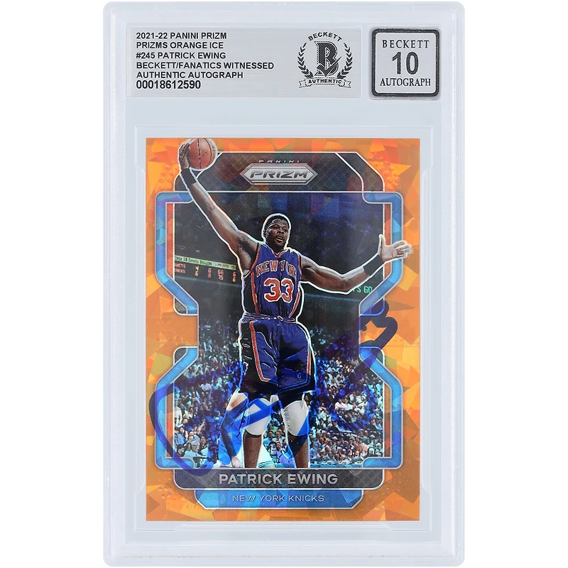 This Patrick Ewing 2021-22 Panini Prizm Orange Ice Prizm #245 Beckett Fanatics Witnessed Authenticated 10 Card is ready to help you display your New York Knicks fandom. Encapsulated in a tamper-proof acrylic case for preservation, this striking card also showcases Patrick Ewing and his unique signature across the front to make it the ultimate collector's item.
