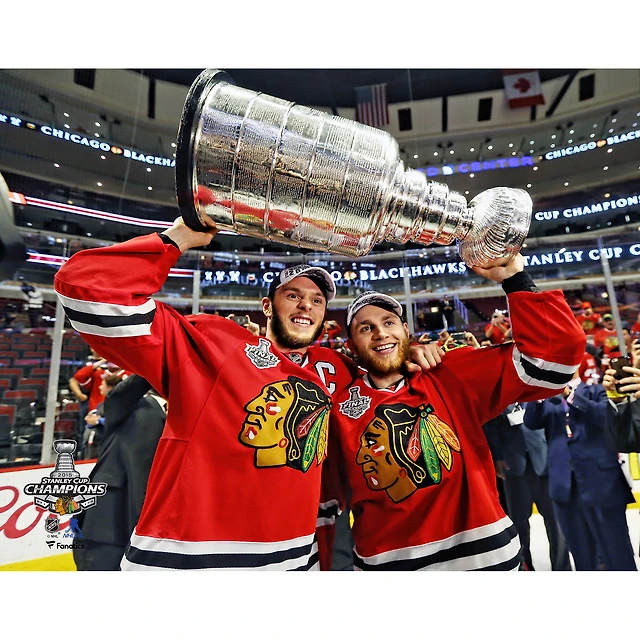 Patrick Kane & Jonathan Toews Chicago Blackhawks Unsigned 2015 Stanley Cup Champions Raising Photograph