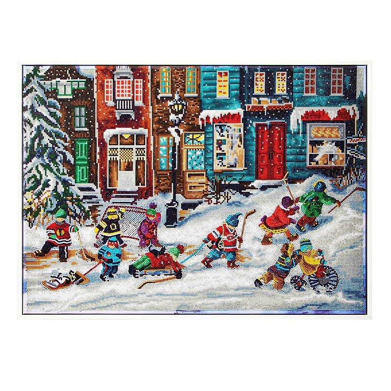 This Diamond Dotz diamond painting kit is a captivating artwork to create yourself, measuring approximately 28" x 20" (71 cm x 51 cm). It immerses you in a playful and colorful world inspired by Quebec artist Pauline Paquin. This craft project allows you to recreate the artwork using thousands of small sparkling resin facets. The kit is designed to provide a complete and enjoyable experience: it includes a high-quality canvas, color-sorted diamonds, a stylus, a tray, and wax for easy application. Perfect for diamond painting enthusiasts and anyone looking to create a joyful and detailed piece for their collection.