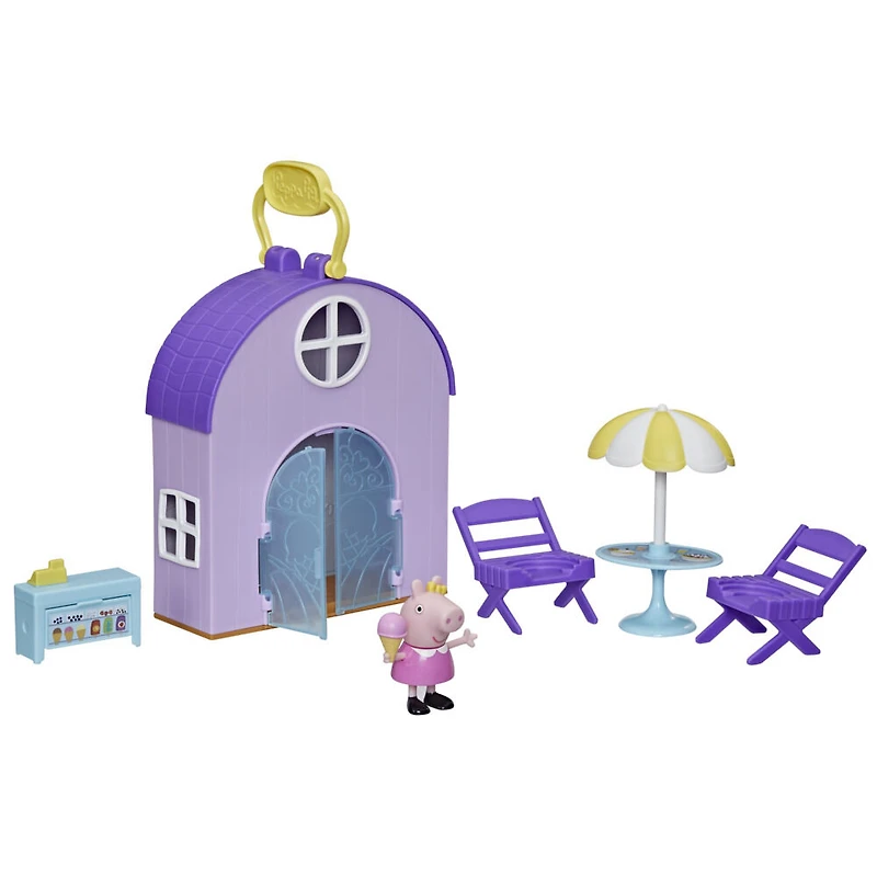 FIGURE, ACCESSORIES AND CARRY HANDLE: Playset includes Peppa figure, 2 chairs, table with umbrella, and cash register with flippable ice-cream display accessories. Carry handle's great for on-the-go fun